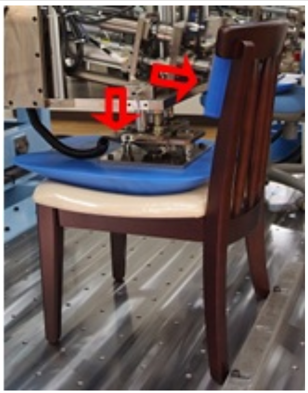 椅背/座面靜載荷強度測試:通過專用加載墊,將規(guī)定的載荷垂直于椅背/座面方向加載,并保持加載力一定時間,重復(fù)若干次。椅背、座面可單獨做靜載荷試驗,也可做聯(lián)合靜載荷試驗。